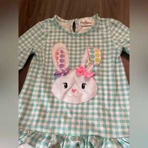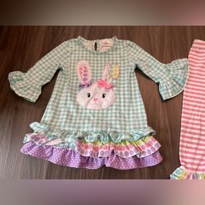 Adorable gingham matching set with bunny applique. Green top with ruffled sleeves. Pink pants with colorful ruffles. Ideal for daily wear .