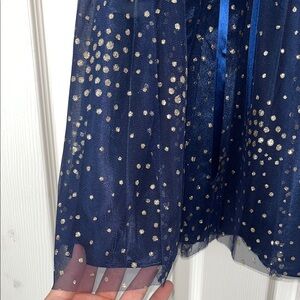 Elegant navy dress with gold polka dots. Features a large bow and sheer sleeves. Perfect for formal occasions.