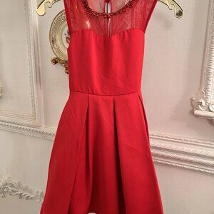 Rare Editions. Sz 7. Girls Red Beaded Dress. Zip. Tie. Lining w Crinoline ruffle. Poly. Box pleated skirt.
