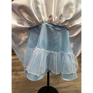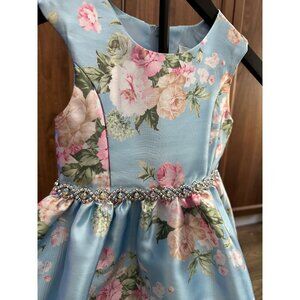 Elegant floral dress with a satin finish, rhinestone belt detail, and a layered tulle underskirt. Designed for special occasions or formal events.