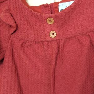 Top: keyhole with button closure, round neck, long sleeves with ruffle shoulders