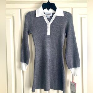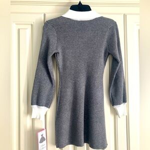 Stylish gray knit dress with white collar and cuffs. Features button details on the front.