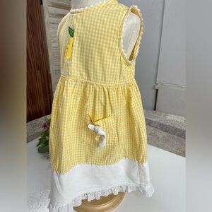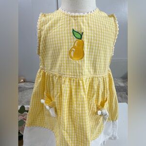 Charming yellow gingham dress with pear embroidery. Features white lace trim and bow accents. Perfect for playful outings.