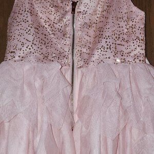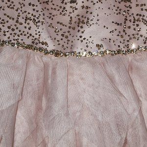 Beautiful girls knee-length dress, great condition. Pink top with gold glitter mesh overlay, beaded waist, zipper closure with button at top and ribbon tie at waist, and pink tulle ruffle bottom. Perfect for weddings, dances, formal events.