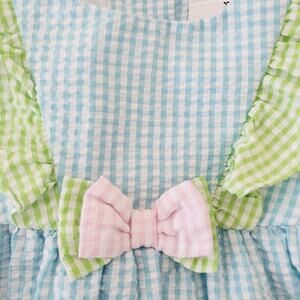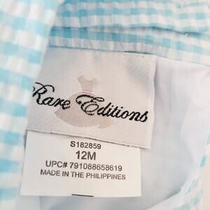 Rare Editions seersucker blue and white striped dress with unicorn patch and rick rack border. Comes with matching bloomers / diaper cover. Ruffled shoulder. Clear buttons in back. Attached tie in back. Size 12M.