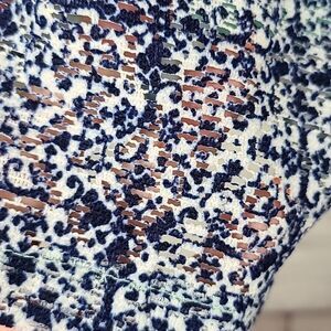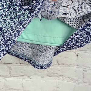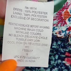 Beautiful printed lace overlay with crochet lace trim sleeves.