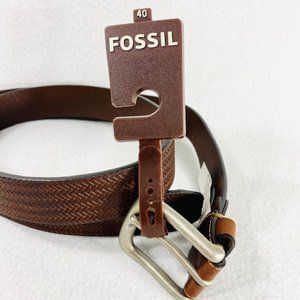Rare Fossil leather belt in a color called "Edsel brown." Woven look texture. Brushed silver hardware. Five hole adjustment. Size 40. New with tags.