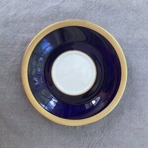 The deep, rich navy blue (often mistaken for a midnight or cobalt blue, especially in bright lighting) is flawlessly accented with an intricate, glowing gold trim, creating a dramatic and luxurious contrast. The creamy "Old Ivory" interior of the cup and the center of the saucer provide a perfect canvas for your favorite beverage. The elegant, ornate gold handle adds a touch of regal sophistication.