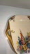 England serving plate in the “Old English Gardens” pattern. Features a charming thatched cottage surrounded by colorful florals. Gold-trimmed handles with cutouts add an elegant touch.