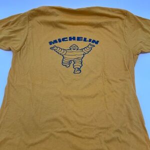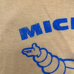 Michelin man printed in royal blue, some crackling (see pic) no rips, holes, etc, very wearable condition
