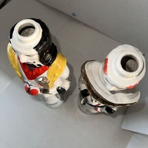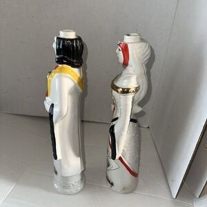 The decanters are empty and come with a height of 16.5", making them a great conversation starter. The multi-color design and originality of these decanters make them a true gem for any collector. Don't miss out on the opportunity to add this rare piece to your collection.