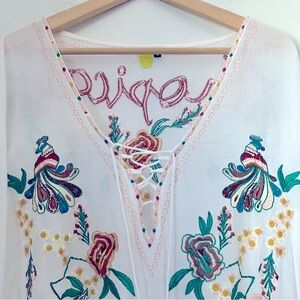 Rare Farm Rio Colorful Embroidered Tropical White Kaftan Beach Cover-up One Size