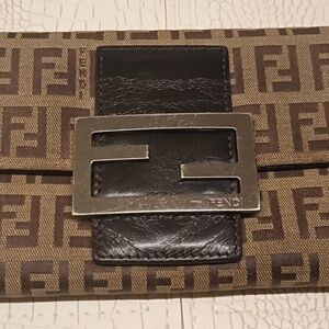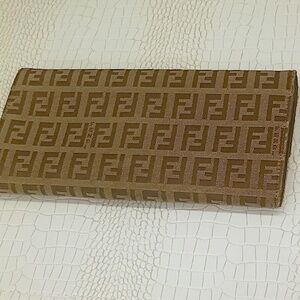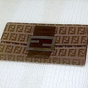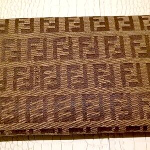 Rare Fendi Long Logo Wallet Zucca Monogram Brown Leather Canvas FF