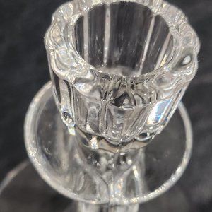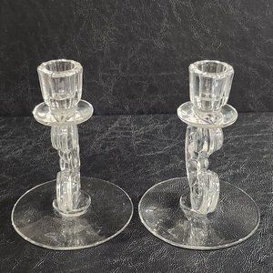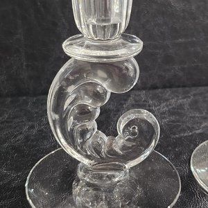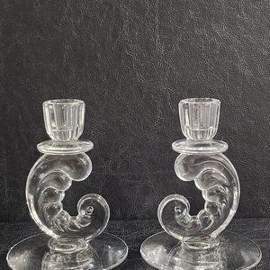 Rare Find Art Deco MCM Fostoria "Plume" Solid Clear Lead Crystal Pair of Candle
