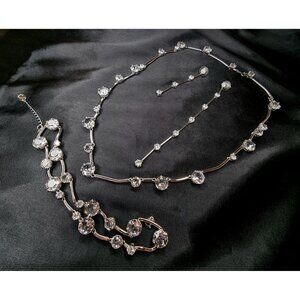The necklace showcases a delicate arrangement of crystals along a curved metal frame, with larger stones strategically placed for a glamorous effect.The bracelet follows a similar design, ensuring a seamless and cohesive look when worn with the necklace.The earrings are long and elegant, featuring a cascading drop style with shimmering crystals that add a refined touch to any outfit.