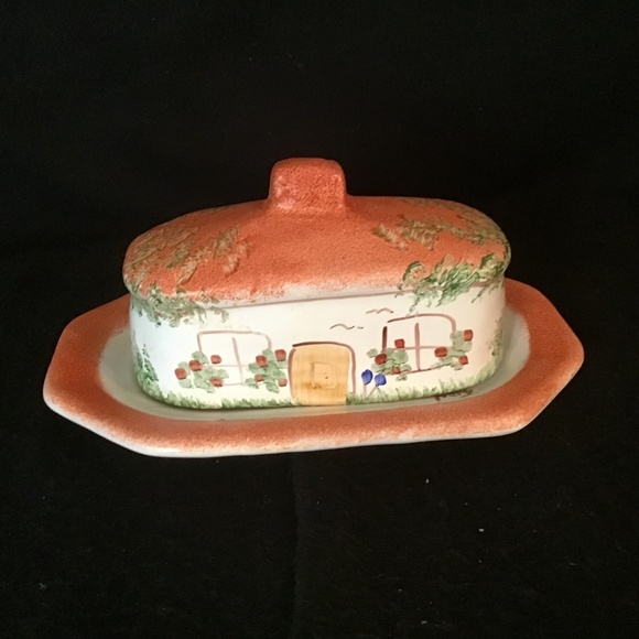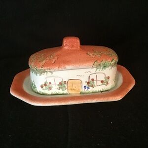 Rare Find- Butter Cheese Lidded Dish Pottery Hand Painted Cottagecore House. Beautiful dish. Very good condition. No chips or crack