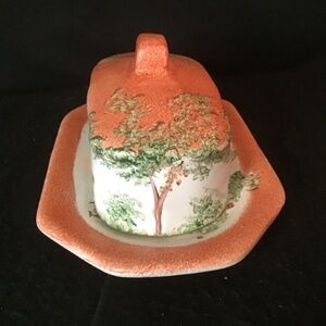 Rare Find- Butter Cheese Lidded Dish Pottery Hand Painted Cottagecore House.