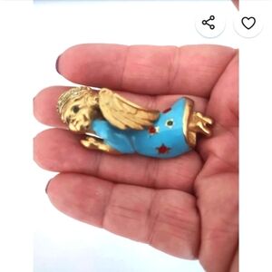 Rare Find Gold Tone Blue Angel W/ Rhinestone Halo Stars, Gold Wings Vintage 80's