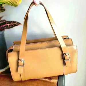 ● This is a beautiful and durable classic Trussardi small bag in a smooth camel Italian leather with "Trussardi" imprinted hardware and contact stitching