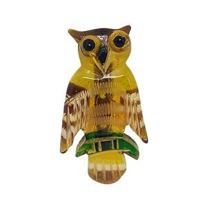Rare Find Vintage 1950s Lucite Owl Brooch Hand Carved Yellow Brown Green 2 1/8"