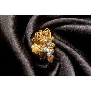 Crafted during the heyday of American costume jewelry (circa 1940s–1950s), this brooch blends the opulence of faux pearls and brilliant-cut glass stones with the romantic flair of an intricate golden floral and leaf motif. The design evokes the elegance of nature frozen in eternal bloom, with delicate detailing reminiscent of gilded garden treasures.