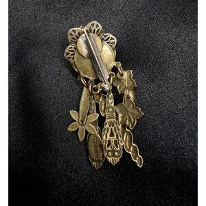 This striking vintage brooch by Sorrelli is a statement piece of mid-to-late 20th century costume jewelry. At its center, a faceted oval crystal glimmers within an ornate gilt-brass frame, surrounded by intricate openwork. Suspended from the main body are multiple charms and dangles—each decorated with rhinestones, glass stones, and symbolic motifs—creating both movement and dramatic elegance.