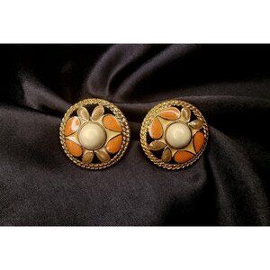Crafted with Trifari's signature precision, these round earrings feature a beautifully balanced floral motif โ where warm amber and soft gold-tone petals radiate around a creamy central cabochon like the heart of a stylized sun. Encircled by a richly textured gold braided border, each earring evokes the feeling of a vintage heirloom, lovingly passed from one era of fashion to the next.