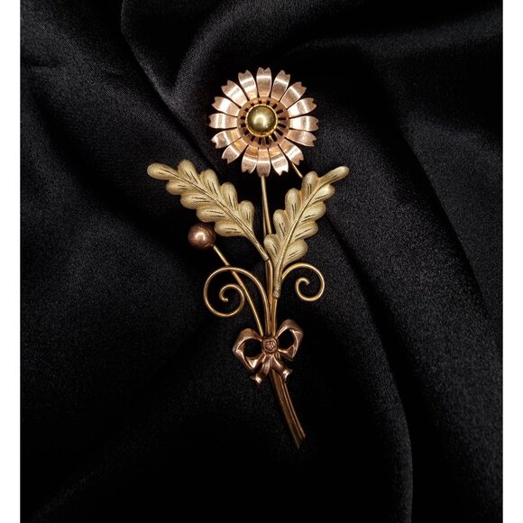 This brooch, crafted by Van Dell, takes the graceful form of a floral bouquet, featuring a large daisy-like bloom with delicately layered petals in rose gold tones, framed by textured leaves of yellow gold finish. At the base, a charming bow ties the composition, symbolizing femininity and timeless elegance.