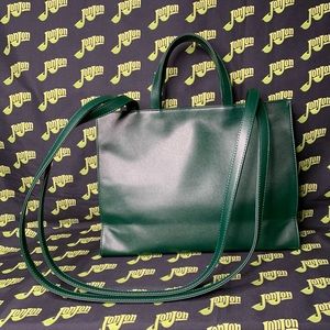 “Featuring a screenprinted front, double strap (handles and cross-body straps), embossed logo, a main compartment with magnetic snap closure and internal zipper pocket. Made from faux leather and twill lining. Bag is packaged in a 100% cotton drawstring bag with screen-printed logo. Medium fits a laptop + your daily survival kit. Height 10 3/4", Width 15", Depth 5", Drop 21".”