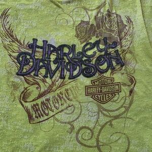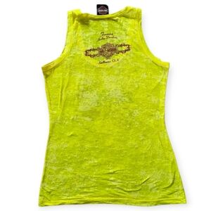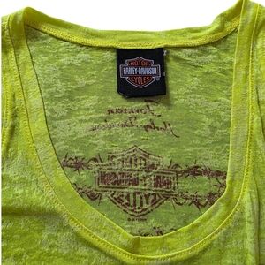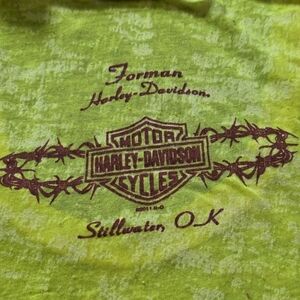 This vibrant yellow burnout-style Harley-Davidson women’s tank top features bold front graphics and a collectible back print from Forman Harley-Davidson in Stillwater, Oklahoma — a dealership that has since closed, making this a rare find for collectors and fans alike.
