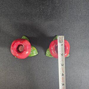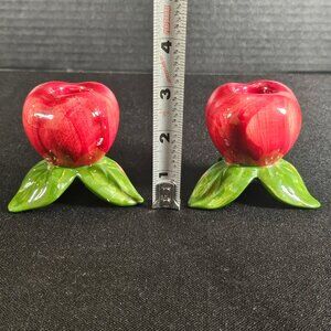 Add a touch of vintage charm to your home decor with this Franciscan Apple Earthenware Candlestick Holder set. Perfect for holding average candlesticks, this set features a beautiful red 3D apple design with three green leaves at the base and a glossy finish. Measures 3 1/8 inch in height. The set comes with two pieces. Crafted from high quality ceramic, this vintage style Candlestick pair is designed to be freestanding and decorative. With its unique design and Apple theme, it's sure to catch the eye of anyone who enters the room. The Franciscan Apple set is the perfect addition to any home decor. Pre owned great vintage condition, no damage. Circa 1956 introduced. Non-smoking pet free home.
