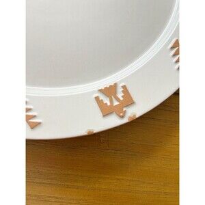 The Frankoma Chop Plate Platter features a Native American White Thunderbird design, measuring 13 inches in diameter. Made of clay in the United States, this limited edition piece is a decorative and artistic addition to any table setting. The glossy white finish with an impressed backstamp showcases the brand's signature style, making this handcrafted item a unique and collectible piece for fans of art pottery and Southwest design. Perfect for serving and displaying food, this round plate is a beautiful representation of Native American craftsmanship.