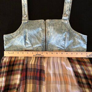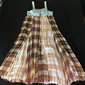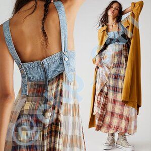Rare and so much fun Rare Free People Mix It Up Dress in size 14. Pieced to perfection, this vintage-inspired maxi dress features a denim, overall-style top piecing and contrast plaid bottom skirt with zip-front neckline and raw bottom hem for a true lived-in look. Relaxed, A-line fit