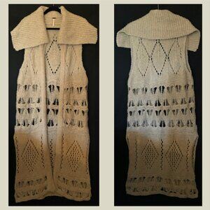 Very rare and so pretty Free People Snowmad Maxi Vest in "Sand/Sable Combo" in size Small. So cool and classic in a crochet-style design, this effortlessly essential vest is featured in a long-line silhouette with super exaggerated collar for added dimension. Relaxed, long-line fit, open-front style, side slits/vents at bottom. The perfect piece to add a touch of texture and dimension to any look, this timeless vest is featured in a versatile, vintage-inspired design. Excellent condition. Please look at all pictures for details & measurements as part of the description. Sold out for many years. Reasonable offers welcome.