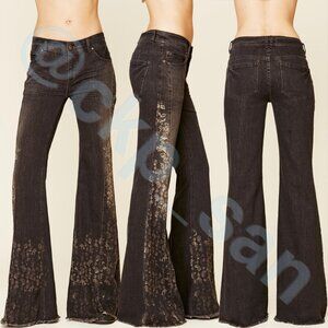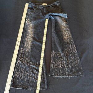 Rare Free People Wildwind Printed Wideleg Jeans in size 30. These were an online exclusive and not available in stores. Faded denim paneled widelegs with frayed bottoms and a subtle design on front of legs. Five pocket design with zip & button closure. Excellent condition. Please see pictures for all for details, fabric content, condition & measurements. Sold out since 2012. My prices reflect the rarity of my items and what I paid for them. Reasonable offers welcome.