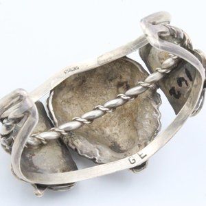 Crafted by the esteemed Navajo artist Gary Edwards, this rare Native American piece is a sterling silver cuff bracelet featuring a meticulously molded figural Buffalo head as its centerpiece, evoking the spirit of the American West. The bracelet is adorned with intricate twisted spring-like detailing, enhancing its dynamic presence, while green trade beads on each side of the focal point add a touch of vibrant color and cultural richness. The swirling designs throughout the piece elevate its exceptional craftsmanship, further accentuated by the marks "GE" and "STERLING," testaments to its authenticity and quality. Despite bearing tarnishing, weighing 80.6 grams, and measuring 5 1/8" tip to tip with a 1 1/2" gap and 2" width, the bracelet remains a striking statement of Navajo artistry and tradition. With a face length of 4 1/2", it commands attention with its bold design and timeless elegance, embodying the spirit of the Southwest in every detail.