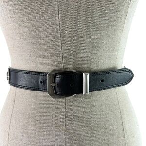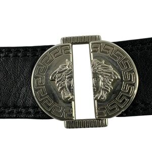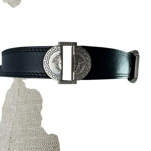You are looking at a genuine black leather belt from Gianni Versace from 1990s. Belt measures 44"6 long with 38" from the first perforation and 42" at its last perforation from buckle and 1"1 wide. The condition of this belt is good for its age with no tears and very minor rubbing on inner side of belt. This Versace belt is made of black leather with silver tone medusas and belt is a great vintage find. 100% genuine GIANNI VERSACE size 40 made in Italy.