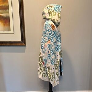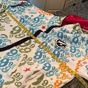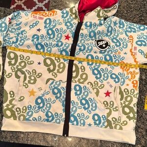 Vibrant hoodie with a bold graphic design. Features a red lining and a unique pattern.