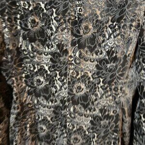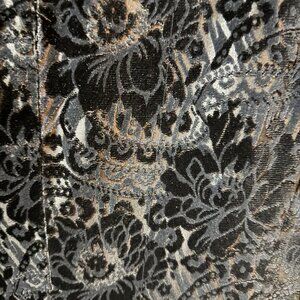 Very dark gray with floral motif. Fabric is darker than most of the pics; the pic of the back of the jacket is closest to the actual color.