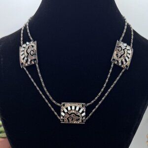 This Sweet Romance necklace is a stunning Art Deco-inspired statement piece featuring rectangular metal panels with intricate designs.