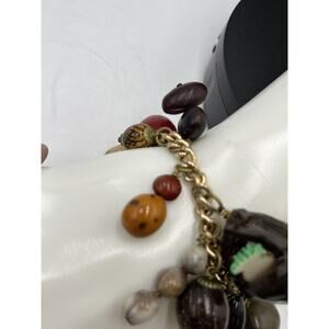 This adorable vintage tiki style bracelet has real nuts, wooden bits, beads and seeds in a variety of rich neutral & natural colors.