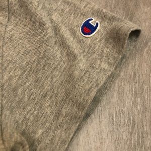 This Champion T-shirt LIKE NEW is a must-have for any sports fan. Featuring the iconic Champion logo embroidered on the front and on the sleeve, this gray T-shirt is perfect for casual wear. Made with soft cotton material, this classic fit T-shirt has short sleeves and a crew neck.