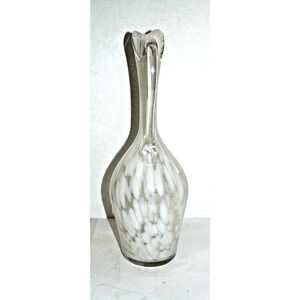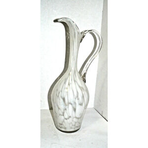 This beautiful vintage glass pitcher vase showcases a stunning abstract pattern in clear and white. The vase stands at 15 inches tall and features a gorgeous mid-century modern style with a glossy finish. It is a rare and unique piece that will add a touch of artistic flair to any home decor. The vase is hand-blown with care and features a handle for easy pouring. It is an original piece, perfect for collectors or those looking for a statement decor item. Add this beautiful vase to your collection today and enjoy its timeless beauty for years to come. Great gift.
