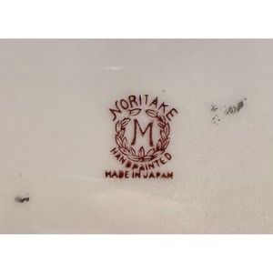 "M" in wreath (for Morimura brothers) and Made in Japan backstamp, dating this dish to between 1921-1942, but most likely from the 1920s or 1930s. The shape/curvature of the dish is soft, rounded, and lovely. There's a figural flower on one side.