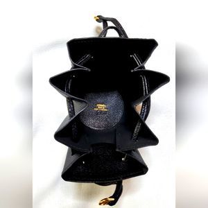 The open top can be cinched in by the two straps that have palladium clasps and a 5-inch drop.