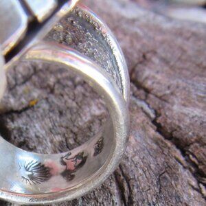 Measures approximately 1-1/2" X 1-1/4". The band width at its widest is approximately 5/8".
