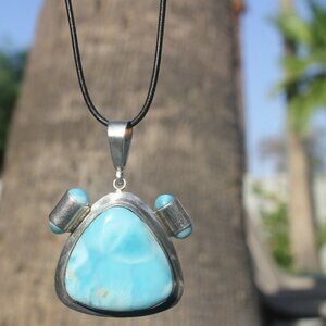 Surrounded by Sterling Silver, this rare high quality Larimar Stone is a semi-triangular shape, with two additional stones; one on either side. The black cord necklace features a sterling silver clasp closure. The entire necklace measures 18". Pendant measures 1 3/8" wide at the bottom portion, and 2" high without the bale. Bale measures 1/2" long, with circle closures added, 5/8" long. This necklace was originally purchased in St. Thomas.
