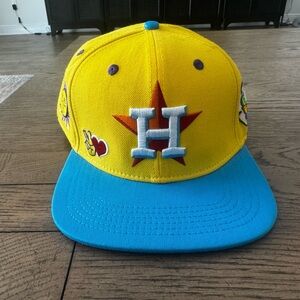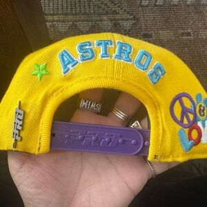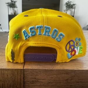 Eye-catching Houston Astros snapback hat by Pro Standard featuring a bright yellow crown with light blue brim and purple snap closure. Packed with retro-inspired details, including embroidered Astros H star logo on front, “ASTROS” on back, and colorful peace/love/flower power graphics all around.