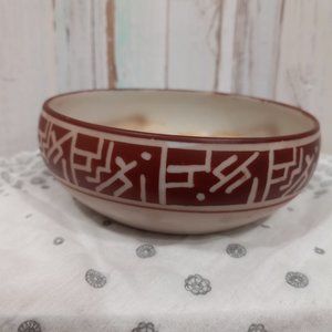 This is an Imperial Nippon hand painted bowl. It measures 4 3/8" across by 1 1/2" tall and features an interesting pattern on the outside. The original manufacturers stamp is on the bottom. This piece is in wonderful condition with some discoloration on the inside. This is a rare and unique piece of art and needs to be displayed.