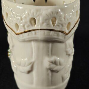 A cute and unique vintage mini boot from the International Bazaar Collection. The white porcelain Santa boot has beautiful cutouts at the top with two colorful green holly leaves accented with Christmas red berries and edged in gilting. There is a bit of gilting under the cutouts at the top of the boot. The boot measures. 3 5/8 inches high, 4 inches long. Note: I have two of these available. Non-smoking pet free home. @ER Shelf2